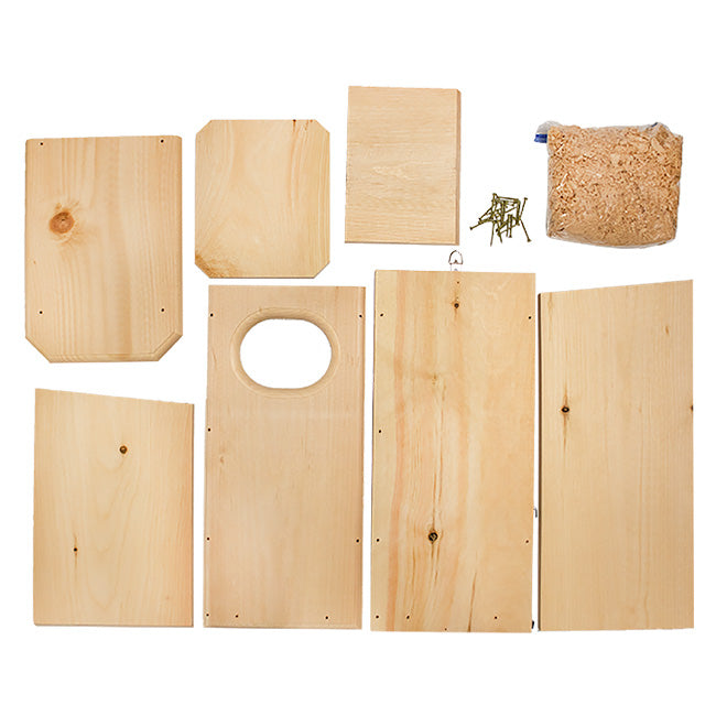 Provide a safe dwelling for local ducks while increasing your knowledge of an outdoor hobby with this magnificent Coveside Unassembled Black Bellied Whistling Duck House. Black bellied whistling ducks, also commonly known as Mexican ducks, are known for their long, pink legs and red bills, as well as their grayish brown plumage; these ducks require a larger opening for their habitats, making this unit an ideal option for these unique waterfowl. This naturally appealing set of panels give you a straightforward and simple way to set up this fabulous box for your outdoor space. Constructed from sustainable pine and sourced from a family owned mill, this natural item sports a 6" by 4.5" oval opening, perfect for the needs of this duck species, with the 0.75” thick pine lending superior insulation for ducklings. A generous, downward slanting roof covers the abode to protect against rain and other outdoor elements, with extended slats just beneath either side of the roof providing proper air flow for ventilating the box. The inside of the front panel features a plastic ladder to allow ducklings to cling for a better grip as they leap from nest cavities within two days of hatching, and the bottom panel leaves gaps at every corner for additional drainage and air flow. One side of the home has two panels that are held in place by metal latches, opening easily upward for close up observation and easy cleanings when necessary, and an included bag of pine shavings lets you set up an appealing nesting space. A metal hanging loop on the top of the habitat’s back panel allows you easily showcase this durable and hardy unit against a tree or post near water to deter the threat of raccoons, and its natural tone will weather over time to a charming gray complexion with exposure to the outdoor elements. This package contains 7 predrilled and easy to assemble panels, along with included hardware so that installation requires only a screwdriver and can be completed quickly. Make a fun project out of giving a safe shelter to unique and colorful waterfowl with this Unassembled Black Bellied Whistling Duck House. Assembly required. Made in the USA.