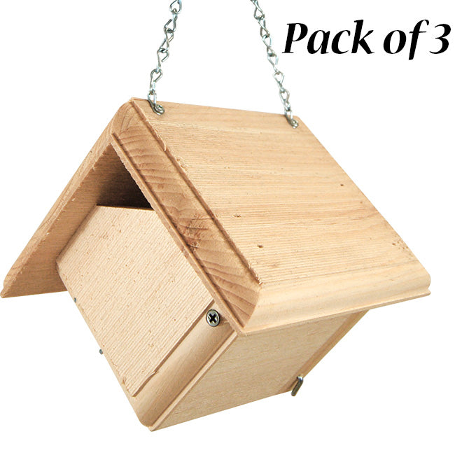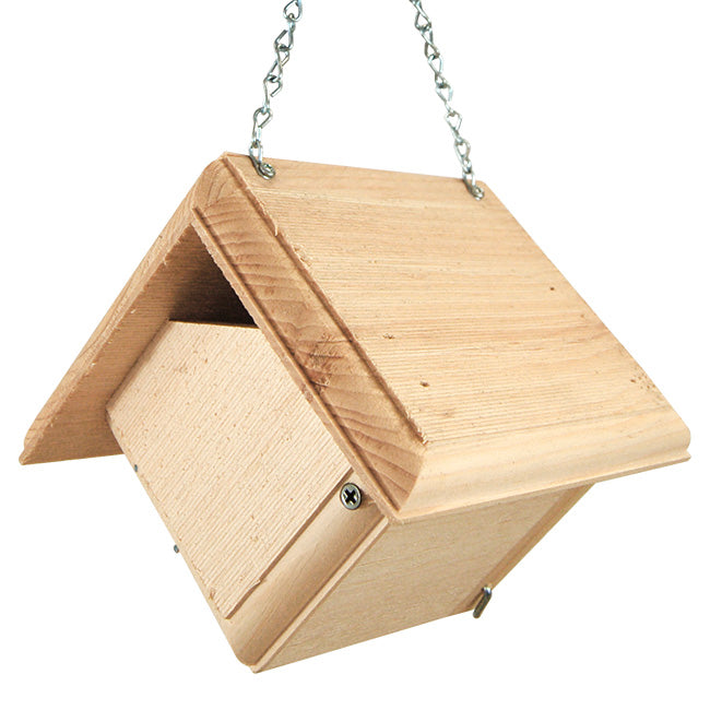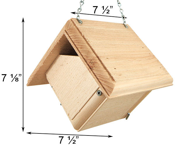 Invite melodious Carolina wrens into your backyard bird garden with the Coveside Carolina Wren Bird House. These active birds share their songs throughout the day, and offering them this comfortable domicile provides them a safe dwelling you can observe right in your backyard. Much like house wrens, Carolina wrens don't mind a house that sways, and the aged pine construction of this unit is sustainably sourced to give you an exceptional and durable roost for these feathered friends. The pitched roof overhangs the body of the house on all sides, protecting the interior from rain and harsh weather. Extended ventilation slots along the sides of the roof keep the internal temperature of the home cozy and well regulated, while a pair of angled corners at the base of the house offer drainage to the nest, keeping it dry. The abode's wide opening specifically accommodates large sticks, giving wrens the chance to bring their material in for a comfortable nest, and the rough hewn pine lets nestlings get a reliable grip when they are trying to exit the box. One side panel lifts upward for easy cleaning and nest checks, and a small metal latch in the corner keeps the shelter securely closed. The 0.75" thick panels lend ideal insulation to the home, while the light color of the unfinished pine assists in keeping it cool during the summer. This unit will age to a graceful and fetching gray tone over time and with exposure to the elements, providing dynamic beauty to your backyard décor. Use the attached chain to easily hang this house from a tree branch or wall bracket for a dazzling, quaint showcase. Offer a comfortable roost that appeals to Carolina wrens with this Carolina Wren Bird House. Made in the USA.