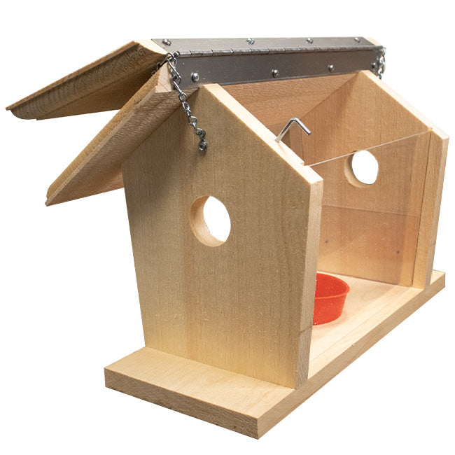 Create a bluebird haven in your bird garden when you add this Coveside Hanging Bluebird Feeder to it. This charming, familiar feeder creates an encased dining spot, allowing small songbirds to eat their fill without the danger of larger birds overpowering them. The classic shape of the unit evokes a hopper feeder, thanks to its pitched roof and clear plastic side panels. The two uprights are crafted from pine, with a 1.5" diameter entry hole near the top of them. This allows small to medium birds to readily enter the reservoir, and the clear sides keep the avian activity visible. A plastic cup sits in the center of this chamber, holding mealworms or 0.5 cups of fruit, berries, or other seed to delight feathered friends. Vary the feeder’s offerings by adding up to 3.25 quarts of mixed or other seed into the reservoir. Its hinged roof wonderfully protects the chamber, and a latch here makes it easy to open and close the feeder for refilling. When opened, one plastic panel also fully removes for thorough cleaning. The attached chain allows the unit to be hung from a bracket in moments, or the flat base can accommodate a bracket (not included) for placement on a pole. Extended landing pads align below the entry holes for your backyard birds, and the rough hewn wood provides plenty of grip. This pine framework handily complements your bird garden, and will age to a striking gray tone over time for a natural, antiqued effect. Offer captivating bluebirds their favorite treats in a cozy, enclosed space with this Hanging Bluebird Feeder. Made in the USA.