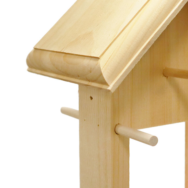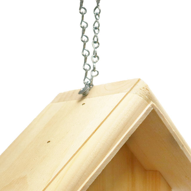 Offer a bevy of different dining options to different types of birds by showcasing this Coveside Jelly, Fruit, and Mealworm Feeder in your bird garden. This durable and naturally beautiful unit is sourced from family owned and sustainably forested pine for a quality, standout item, and its fly-through design beckons birds to dine comfortably in your yard. A removable, red plastic feeding tray rests in the middle of the unit's platform, firmly secured for reliable use as a wealth of various bird species visit and feast. Tropical birds subsist on fruit during winter months and seek out sweet treats when visiting northern areas. This handy receptacle is ideal for placing dried or sliced fruit, mealworms, or sugar water to attract bluebirds, orioles, and a multitude of other species. For a different option, fill the receptacle with a third of a cup of jelly for an additional sweet offering. Ample skewers on both sides of the feeder lend a perfect spot to add more fruit to each side, rounding out a robust smorgasbord for birds seeking these flavors. A pair of perches are situated on either side of both skewers, offering a wealth of resting spots while feasting, and the pitched roof provides coverage and protection from outdoor elements for a pleasant dining experience. Resting at the top of the unit is a chain hanging loop to allow an easy showcase as you place this handy feeder on a hook or branch in your garden. Over time and exposure to weather, this natural pine complexion will weather to a gray tone for a varied and arresting look, lending further appeal and charm to this durable item. Bring birds of all kinds to your backyard sanctuary when you display the fantastic Jelly, Fruit, and Mealworm Feeder. Made in the USA.