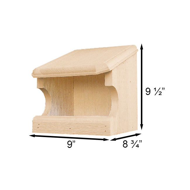 Provide shelter to different bird species by placing this Coveside Open Nest Box in your yard. This platform style home encourages phoebes and robins to frequent your area, as these birds tend to nest in open areas rather than enclosed cavities. The 7" wide and 3.75" tall, front expanse allows these birds to enter the unit, and inward arches on both side panels offer extra visibility and design. A 2" tall, front lip creates perching spots, and the roof overhangs this section, keeping it dry. Its significant slope directs water away from the cavity, and drainage holes in the back allow any captured water to escape. Two predrilled holes on the wide, flat back make it easy to affix this nest to a wall, tree, or fence, and the all pine construction forms a hardy domicile. For a different display, place a mounting plate (not included) on the base to pole or post mount the item. Its unique design is great for easily monitoring nesting activities, and increases the variety of birds you may see in your garden. Add a songbird-specific roosting site to your yard with this Open Nest Box. Made in the USA.