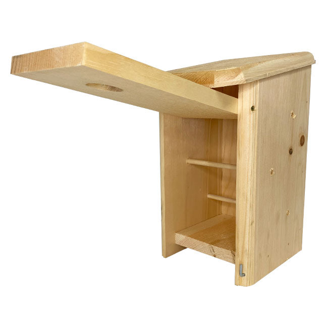 Offer songbirds a warm retreat from harsh winter weather using the Coveside Small Winter Roost. This roosting box features a 1.5" entrance opening at the bottom, ideal for keeping warmth within the box as birds rest. As warm air rises, it is trapped inside the abode rather than exiting through the entrance hole, ensuring that residing birds will remain toasty. A trio of perches inside the shelter offer room for several birds to comfortably roost at once, and the front of the box lifts upward for easy cleaning and observation, with an "L" shaped metal hook keeping the panel securely closed. The small entrance hole is protected by a repurposed slate guard sourced from old Maine architecture to discourage pillaging squirrels, and this unit's slanted roof allows water to run off of it, rather than into the home as birds take solace from the elements. Use the included metal hanger to easily mount this roost on a tree or post, facing the entrance away from prevailing winds for maximum protection. Handcrafted from solid, eastern white pine, this shelter will age to a beautiful silver patina, and will never need to be painted or stained. Give birds the comfort and safety they need to hunker through the winter elements with this Small Winter Roost. Made in the USA.
