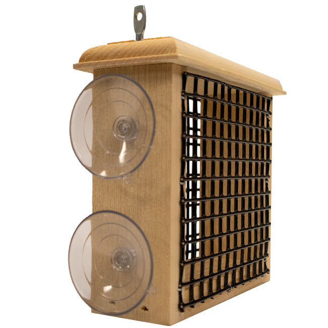 Make observing birds feeding a part of your daily routine with this Coveside Window Suet Feeder. This compact, straightforward suet feeder readily affixes to a window, encouraging your feathered friends to dine near you. The traditional, white pine frame creates a rustic and robust feeder, while a vinyl coated, black metal mesh completes the unit. This 0.375" square grid not only provides a variety of clinging spots for select birds; it also keeps a suet or seed cake nicely in place while allowing birds to dine. The roof sports a slightly rounded edge and overhang, directing water away from the chamber, and a generous screw here may be removed for swiveling this panel and refilling the reservoir. Dual suction cups aid in affixing the feeder to a window in moments, and the compact shape keeps the rest of your yard visible. The yellow hue of the untreated pine ages wonderfully to a gray tone, and the vinyl coating on the grid makes it easy to clean and maintain. Easily monitor bird feeding behaviors from the comfort of home when you add this Window Suet Feeder to your window. Made in the USA.