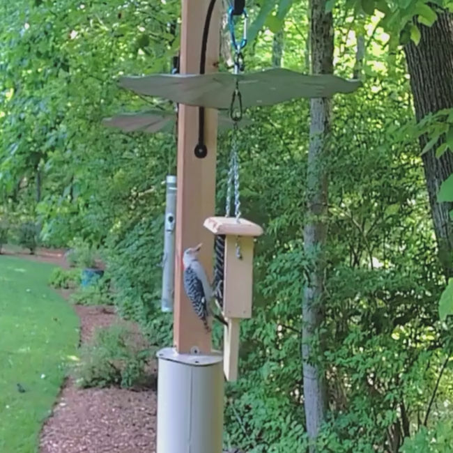 Offer woodpeckers and other feathered friends a tasty and nutritional treat in your garden with this Coveside Woodpecker Suet Feeder with Tail Prop. This standout feeder is made of pine sourced from a 140-year-old, family owned mill using sustainable forestry methods, ensuring you a unique and quality birding accessory. The black, vinyl coated screens on either side of the feeder sport 0.5" x 0.5" squares to afford hungry avians plenty of clinging options while holding the treats securely inside, and the extended tail paddle lends balance for birds as they feast. This handy unit is particularly helpful to woodpeckers and flickers looking for suet during the winter months, and you can lift the lid of this item upward easily to insert up to two standard suet cakes, giving optimal quality and quantity as birds seek out a nourishing treat. Alternately, stock the item with large chunks of corn or a seed cake to provide a different type of caloric snack. The attached, chain link hanger makes this naturally appealing item easy to hang from a bracket or hook in your garden, allowing you a simple and fabulous backyard showcase. As the pine construction weathers, it will age to a beautiful and natural gray with exposure to the elements, giving you a different, striking look as time passes. Invite different types of birds to comfortably dine with this Woodpecker Suet Feeder with Tail Prop. Made in the USA.