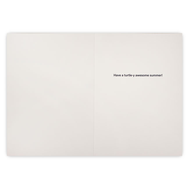 Celebrate the summer months with joy and fun and deliver an uplifting message to a loved one or friend with the festive "Turtle" Summer Greeting Card by Prime Retreat. This whimsical and playful greeting is printed on a cream-colored card and its cover features a vivacious and detailed illustration of sea turtles, surrounded by various ocean fish, gliding happily through the water. The yellow and orange tones of the smaller fish blend beautifully against the blue-green hue of the turtles, and the variable blue and white ocean color completes the laid-back and pleasant motif. Appearing on the center of the scene is the phrase "Just Swimming By To Say..." in wavy, yellow letters. Open the card to find a magnificent interior message reading "Have a turtle-y awesome summer!", letting you wish the recipient a great set of summer months in a clever and lighthearted way. For added customization, include a personalized note beneath the phrase to spell out a unique message for your friend or loved one. Alternatively, leave the inside portion uncustomized and fill in the details by hand at a later date for a different method of personal touch. This brilliant card arrives with a robust, cream-toned envelope for safekeeping and attractive presentation, letting you deliver this thoughtful greeting in secure and wonderful style. Make a friend or loved one laugh while expressing your hopes for them to enjoy a fantastic summer with this magnificent "Turtle" Summer Greeting Card. Printed in the USA.